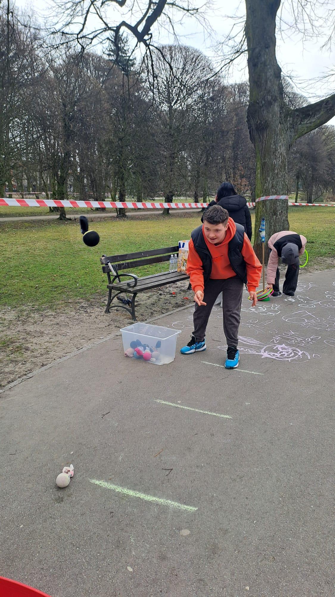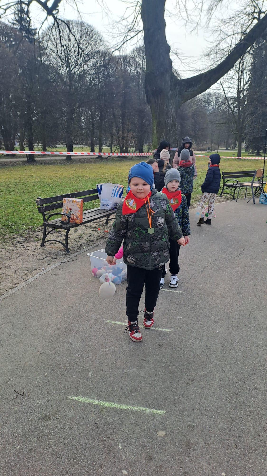 Uczestnicy biorą udział w biegu w parku. Z uśmiechami na twarzach przekraczają linię mety. Biorą udział w rozgrzewce przed startem. W międzyczasie robią zdjęcia wnkolorowej fotobudce ustawionej przy linii mety i biorą udział w aktywnościach plastycznych.
