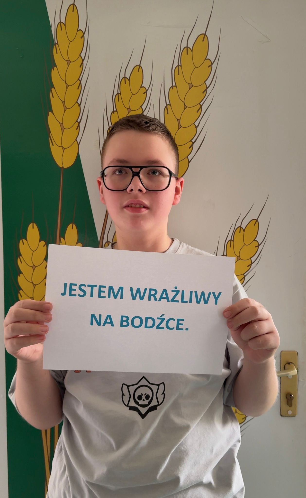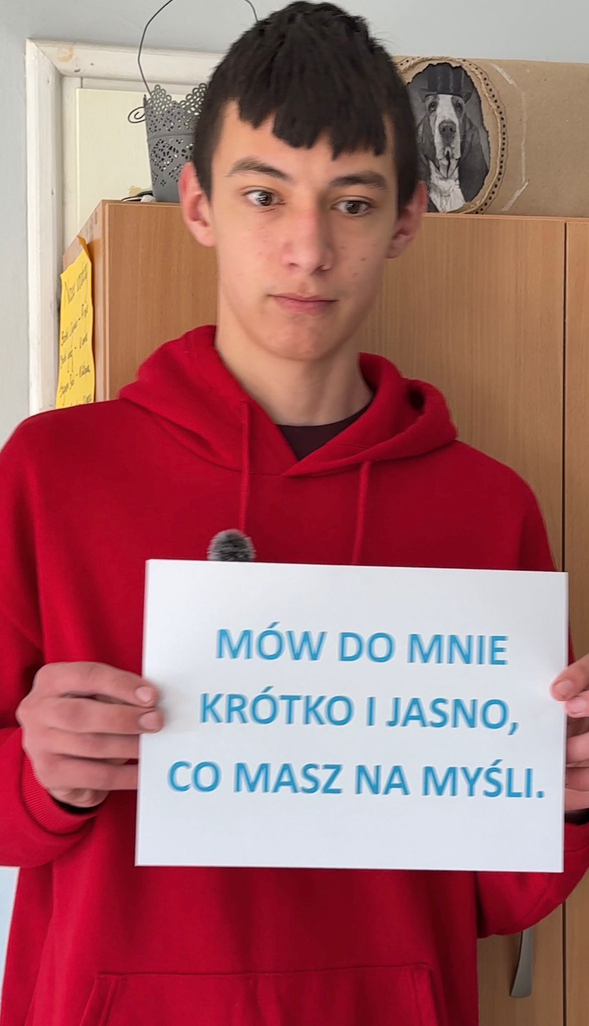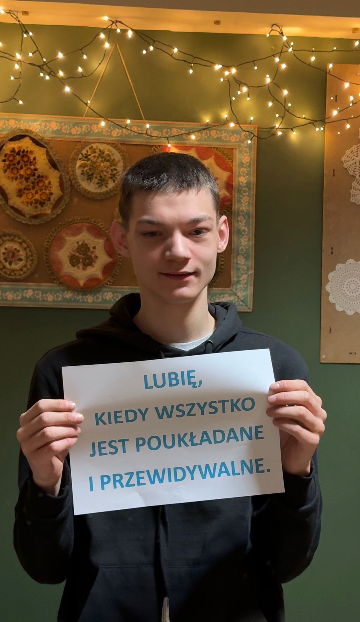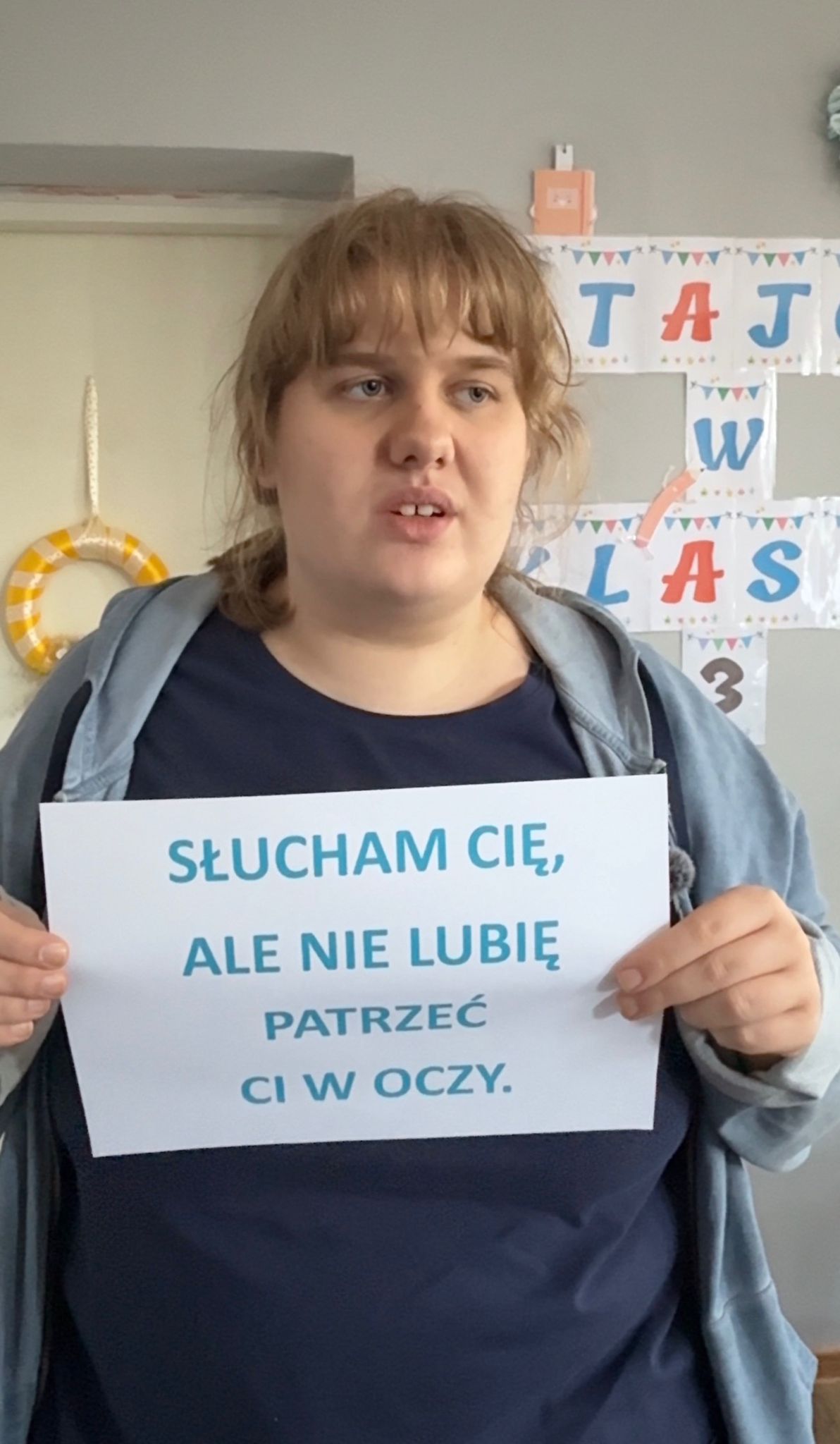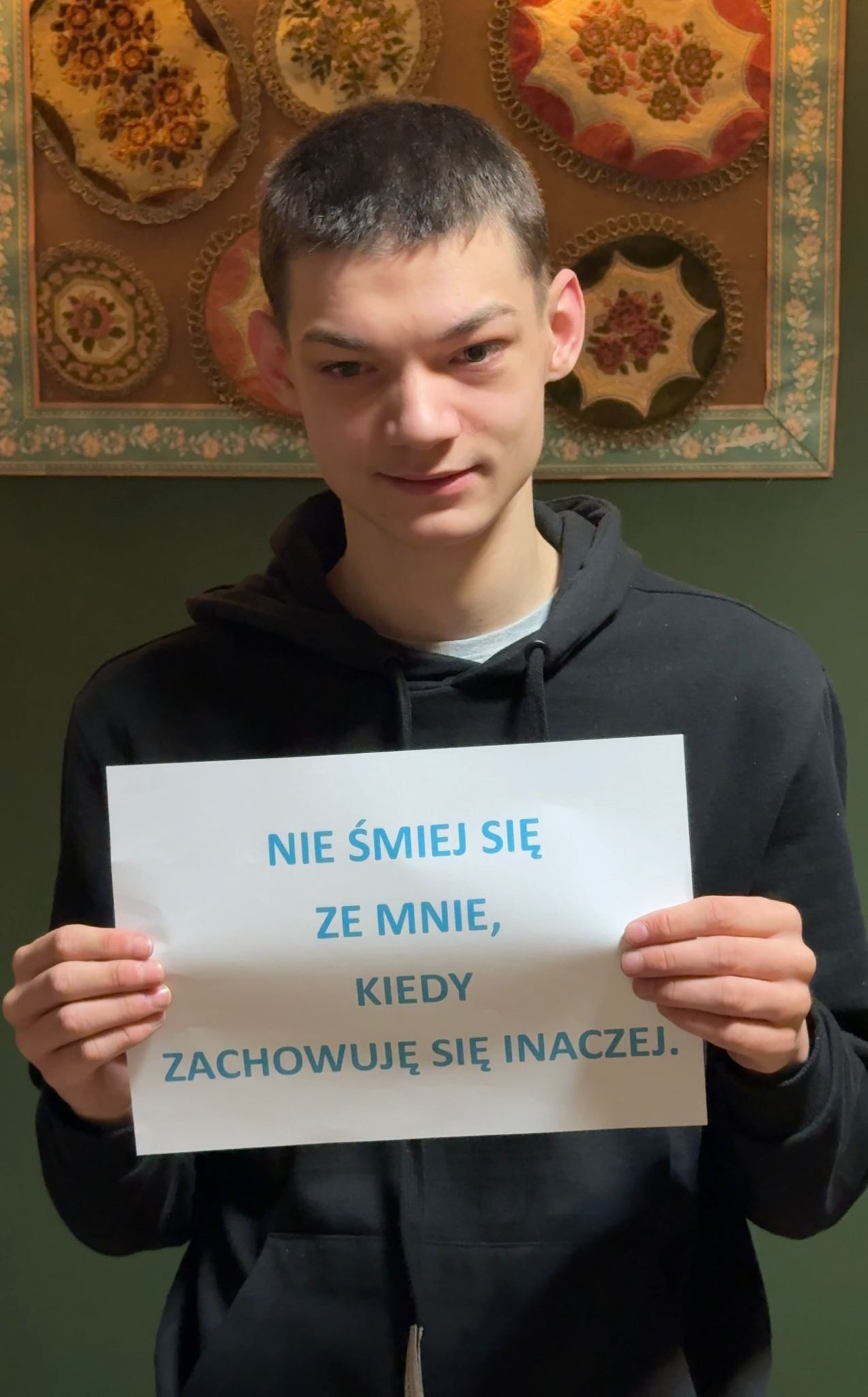 Uczniowie pozują do zdjęć prezentując hasła nawiązujące do funkcjonowania osób w spektrum autyzmu, np. "Jestem wrażliwy na bodźce", "Mój mózg działa trochę inaczej", "Nie rozumiem żartów albo tego co ktoś ma na myśli", "Nie śmiej się ze mnie, kiedy zachowuję się inaczej", "Mów do mnie krótko i jasno co masz na myśli", "Pomóż mi nawiązać relacje", "Nie lubię zmian"