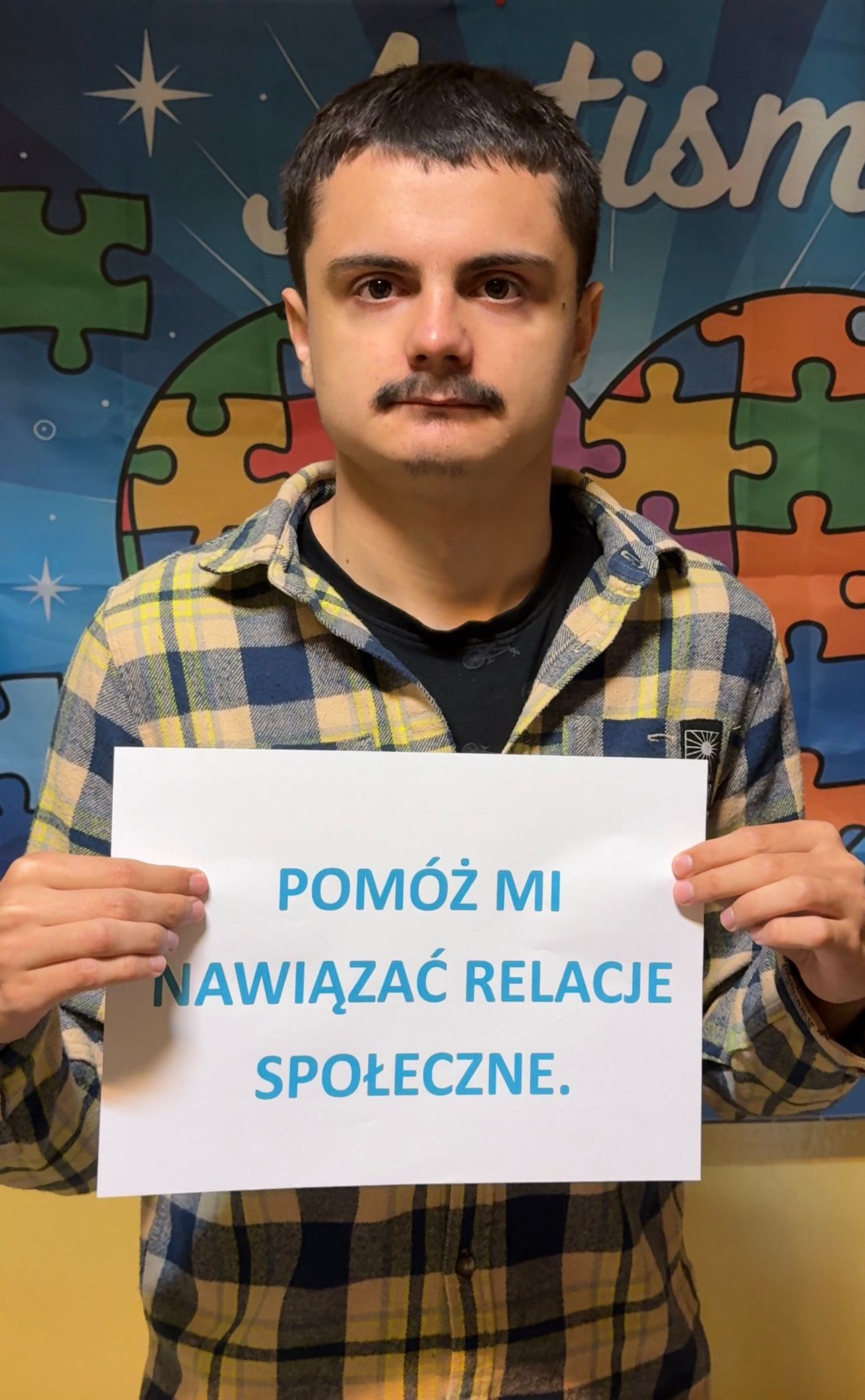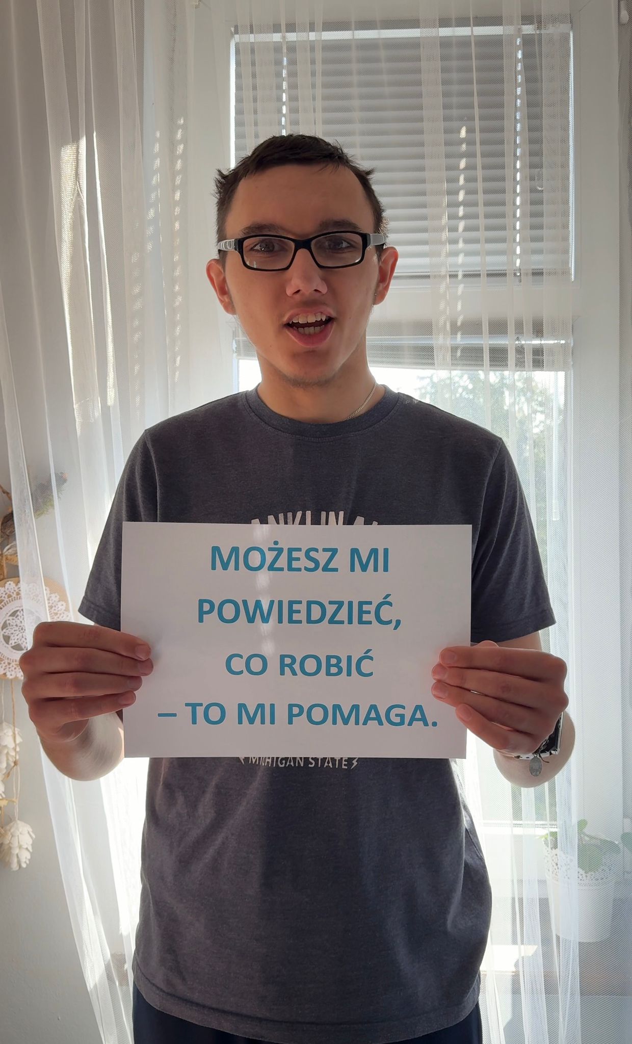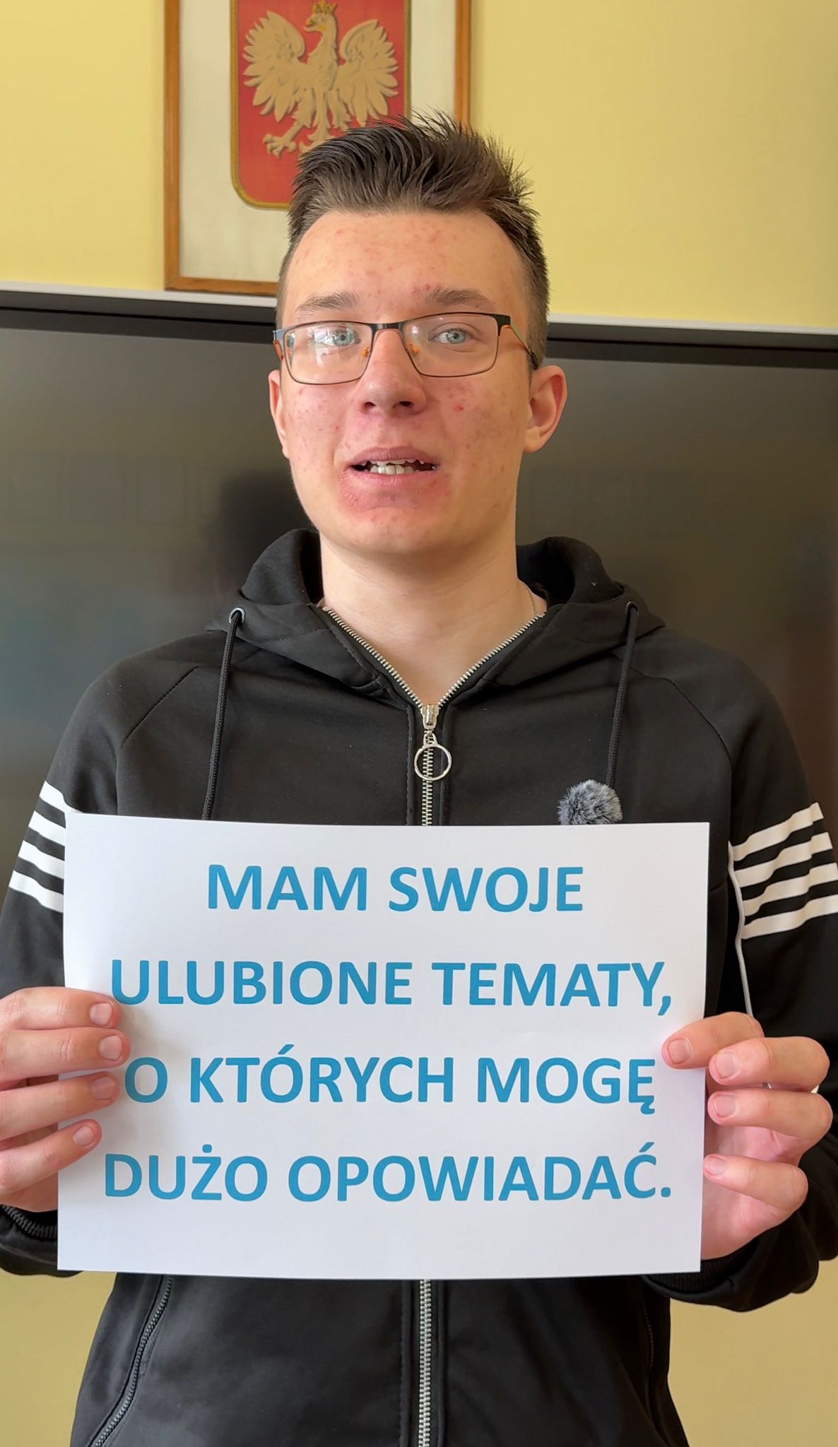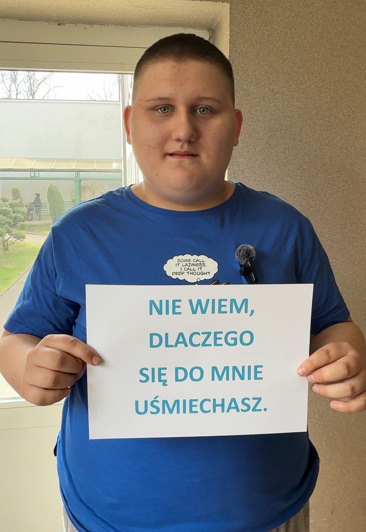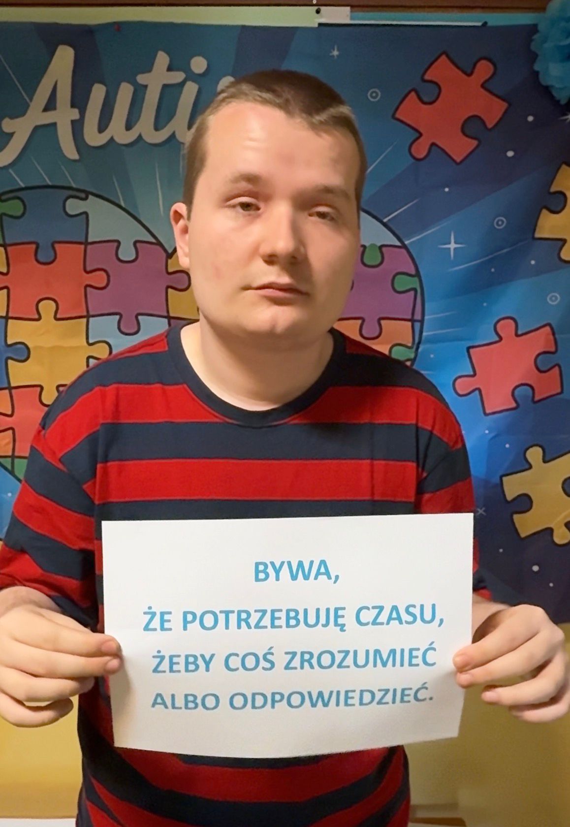 Uczniowie pozują do zdjęć prezentując hasła nawiązujące do funkcjonowania osób w spektrum autyzmu, np. "Jestem wrażliwy na bodźce", "Mój mózg działa trochę inaczej", "Nie rozumiem żartów albo tego co ktoś ma na myśli", "Nie śmiej się ze mnie, kiedy zachowuję się inaczej", "Mów do mnie krótko i jasno co masz na myśli", "Pomóż mi nawiązać relacje", "Nie lubię zmian"