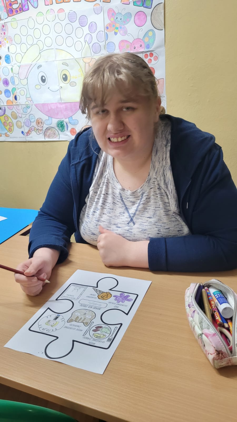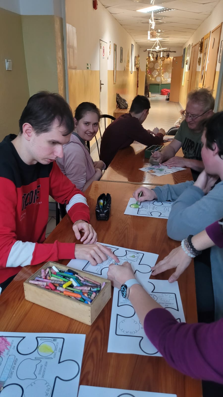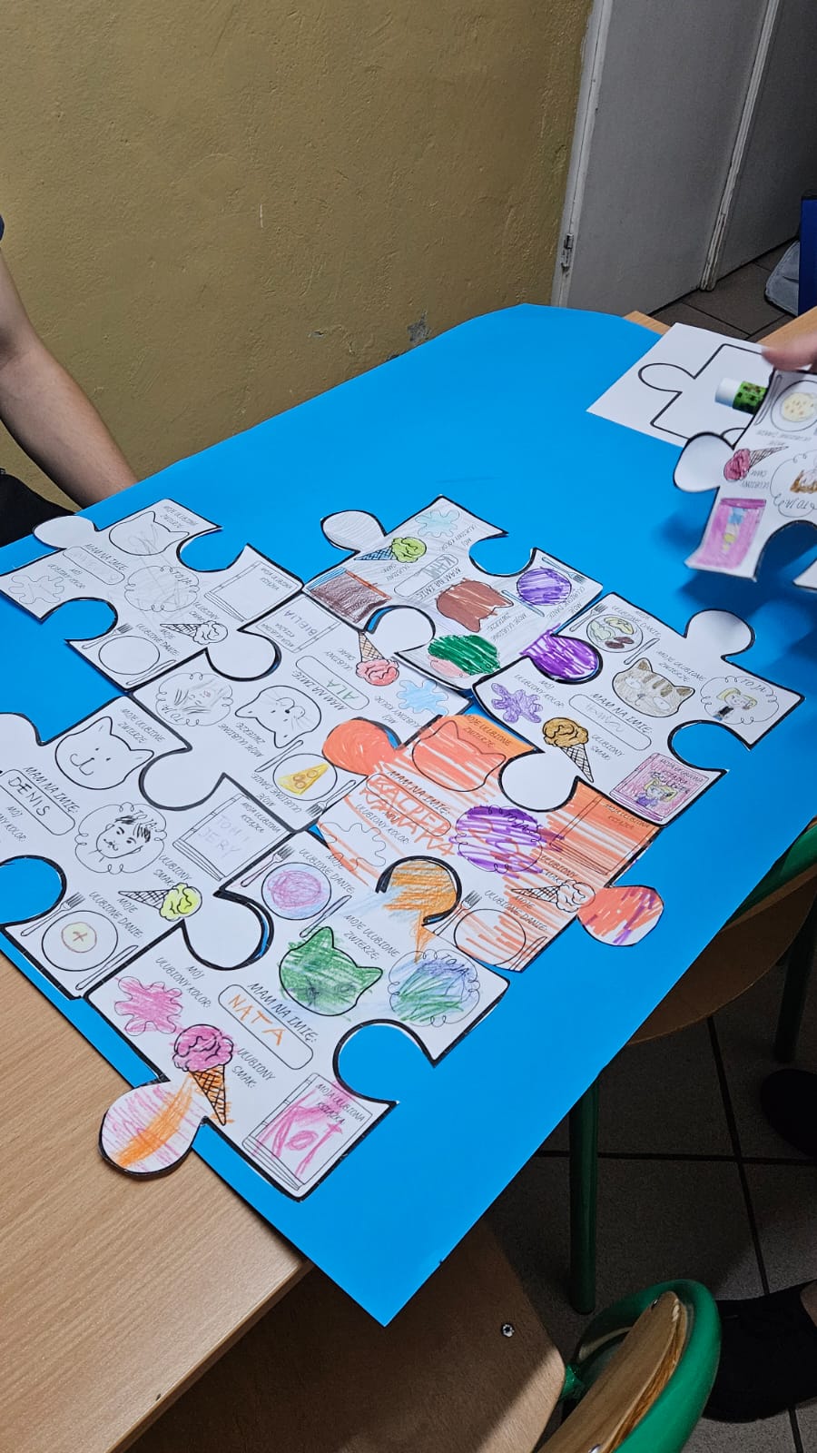 Uczniowie siedziący wspólnie przy długim stole. Każdy koloruje kawałek puzzla, które stworzyły plakat.