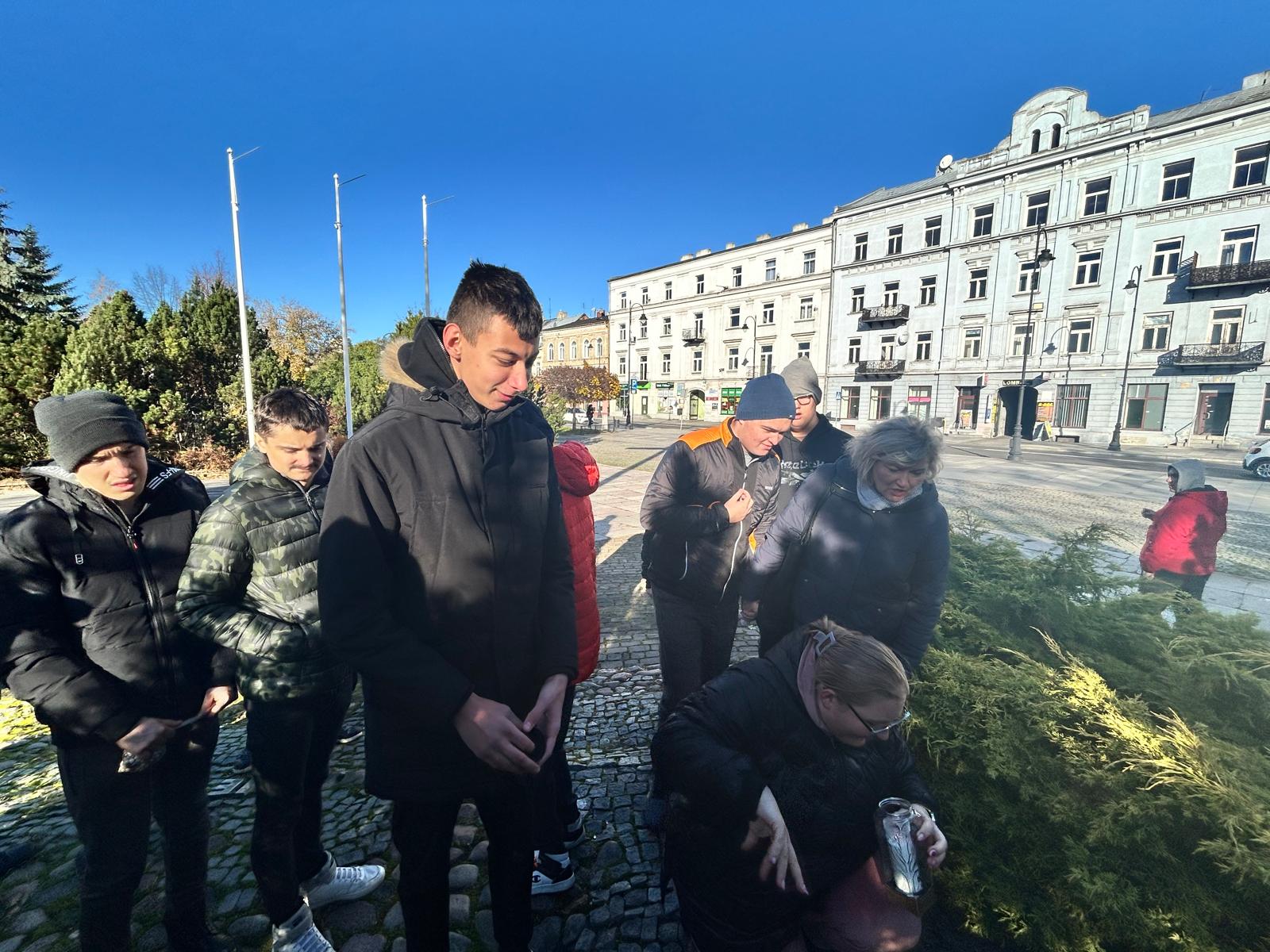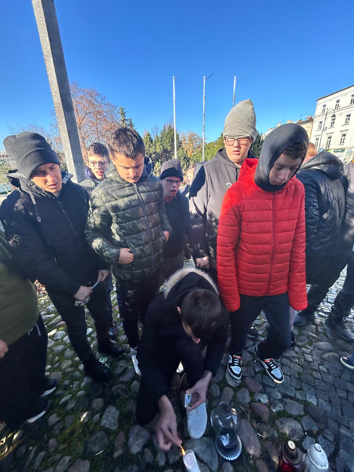 Uczniowie zapalają znicze na cmentarzu wojskowym oraz pod pomnikiem Jana Pawła II.