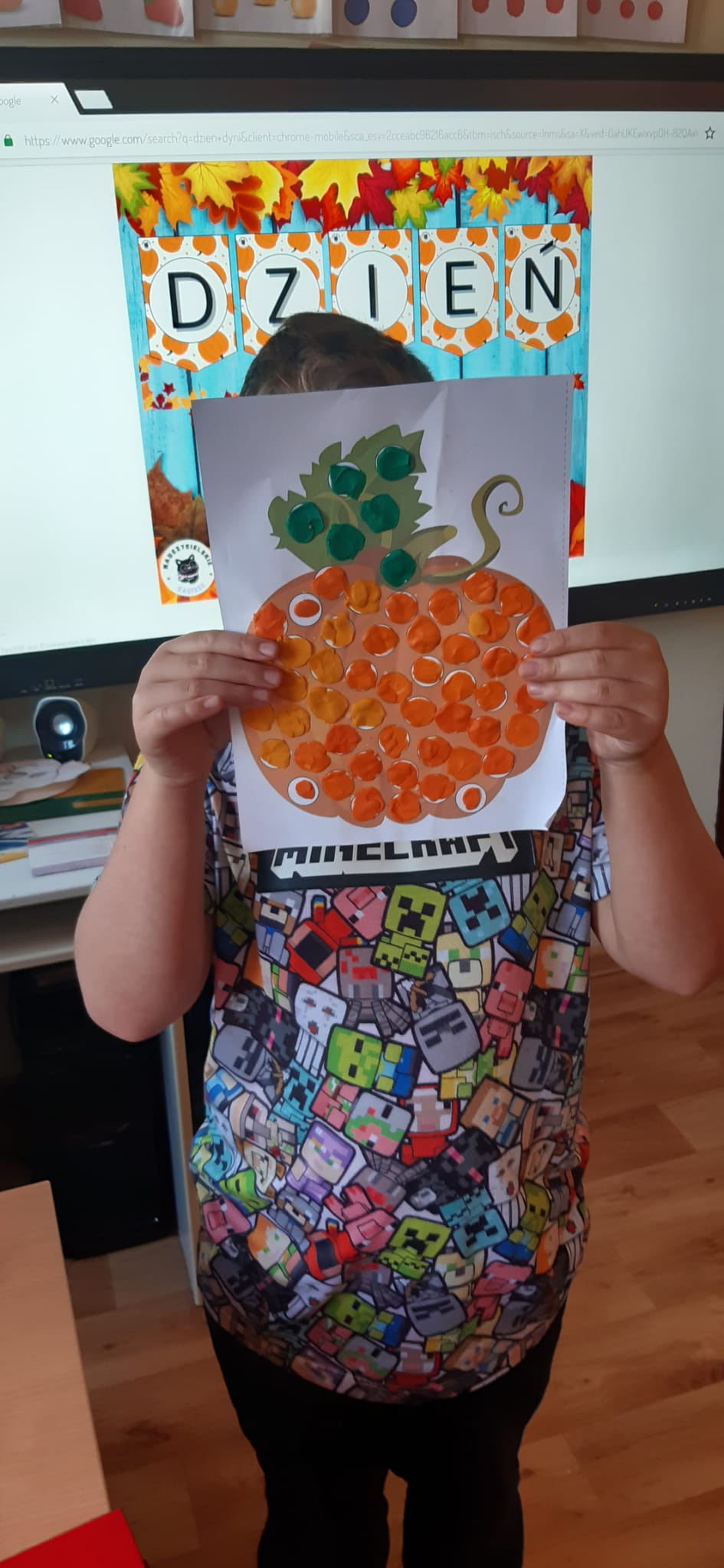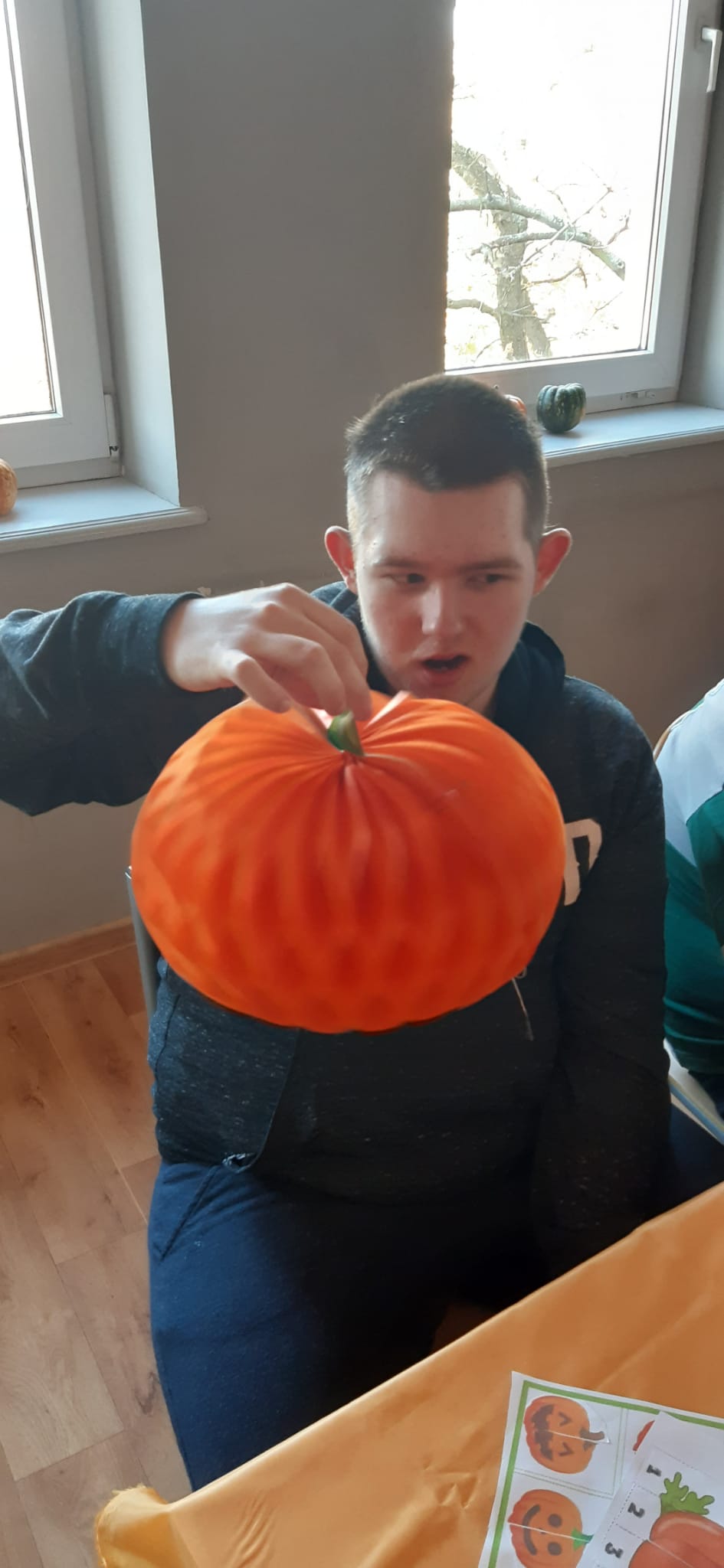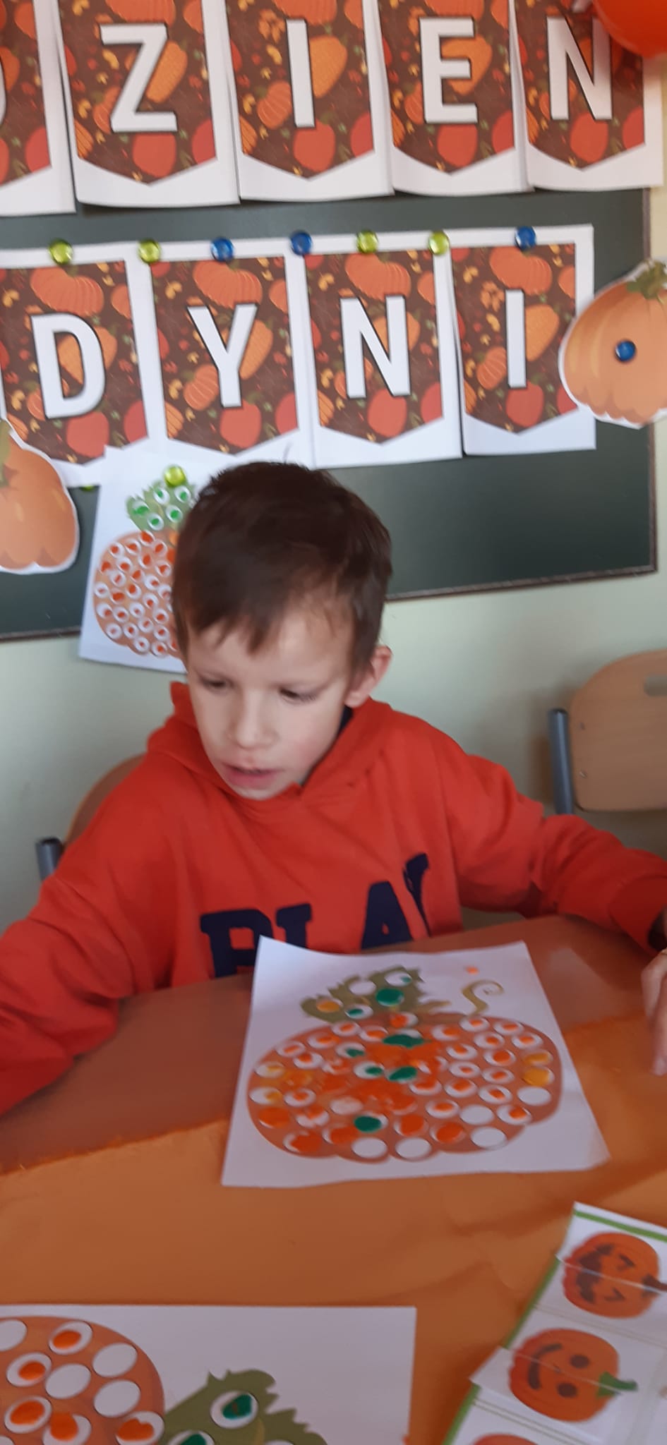 Zdjęcia przedstawiają dynie oraz uczniów pracujących z kartami pracy związanych tematycznie z dyniami.