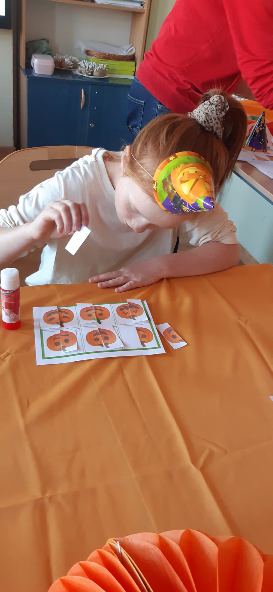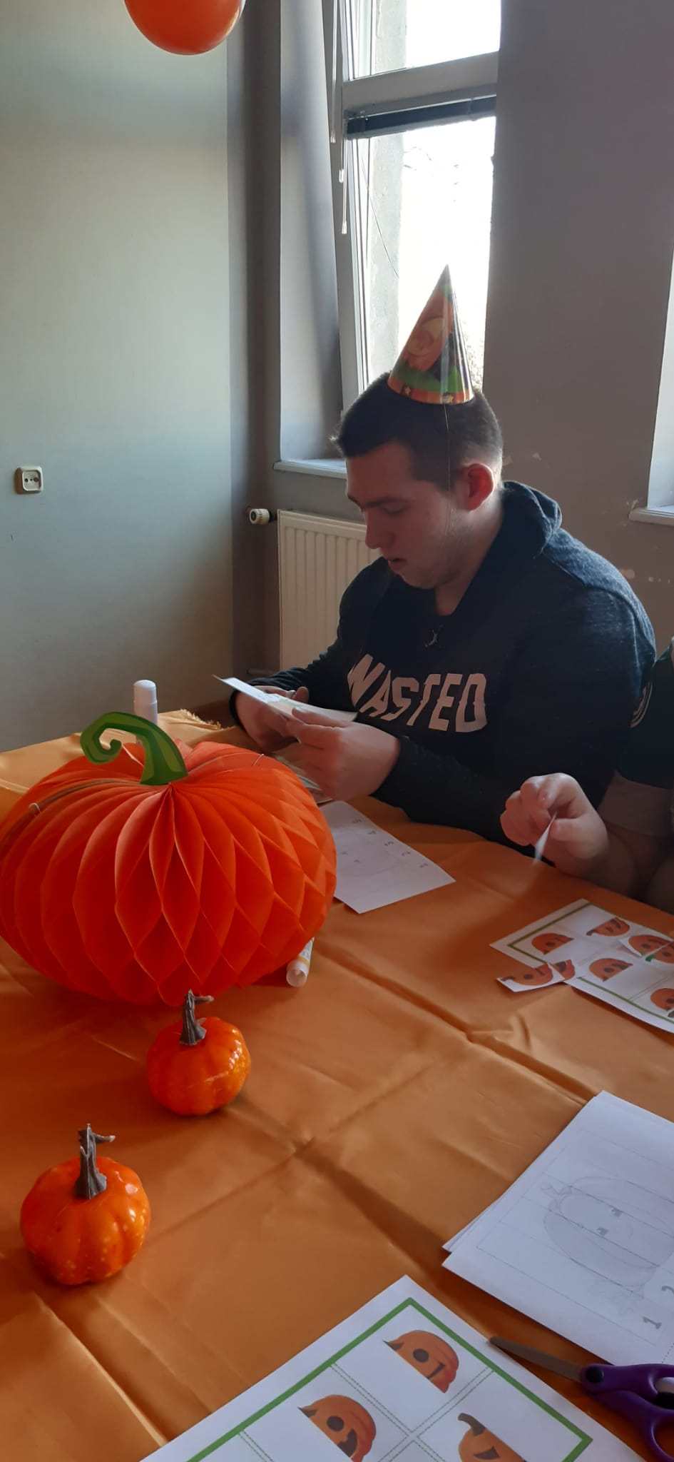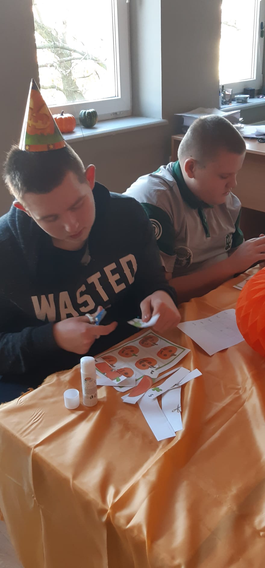 Zdjęcia przedstawiają dynie oraz uczniów pracujących z kartami pracy związanych tematycznie z dyniami.